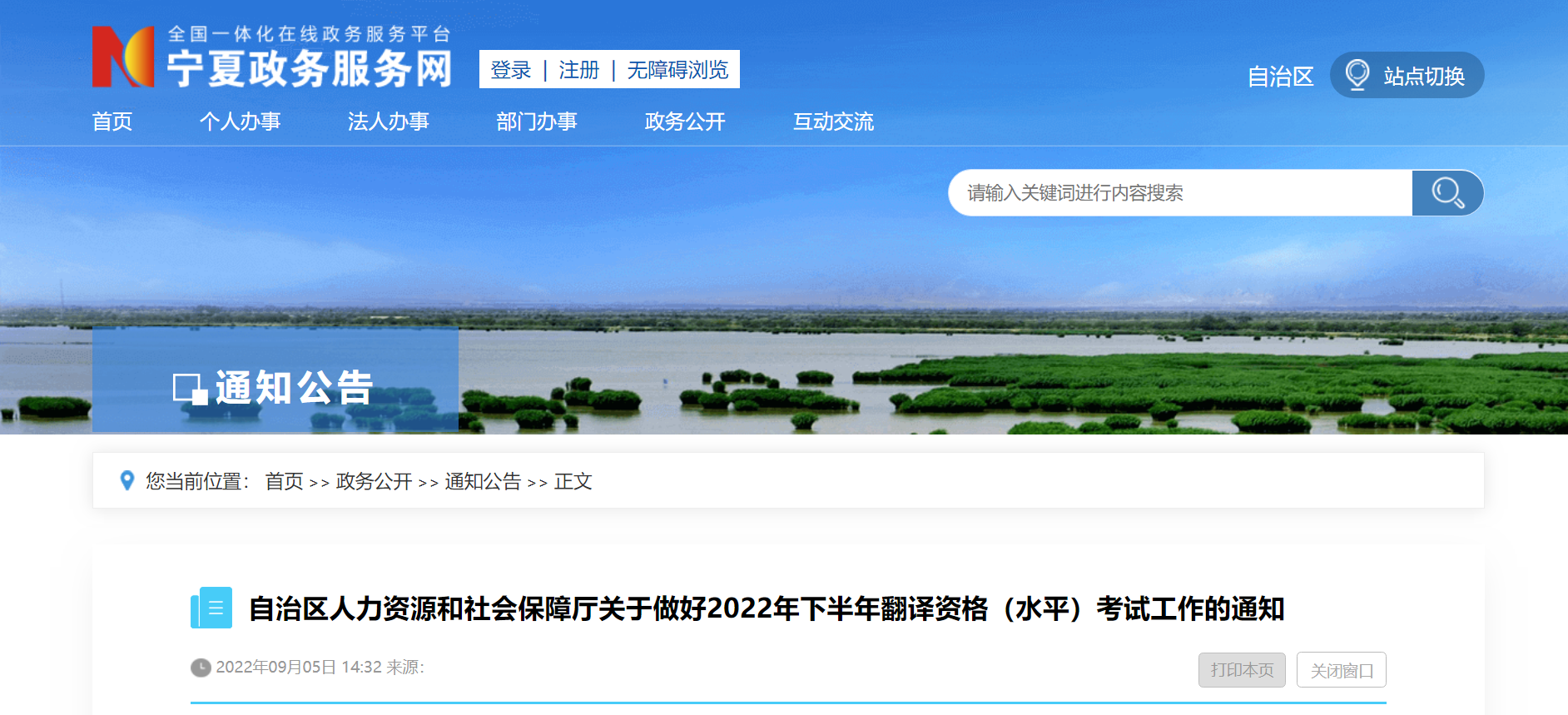 我區(qū)2022年下半年翻譯專業(yè)資格(水平)考試推行報名證明事項告知制,采取網(wǎng)上報名、網(wǎng)上繳費、網(wǎng)上打印準考證、考后現(xiàn)場資格審核的方式進行。根據(jù)疫情防控要求,報名只接受現(xiàn)工作地或居住地在寧夏的報考人員。
