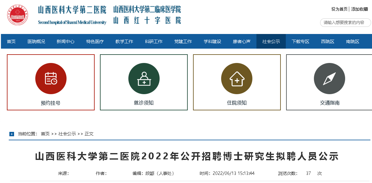 2022山西醫(yī)科大學(xué)第二醫(yī)院招聘博士研究生擬聘人員公示已出,公示時(shí)間:2022年6月13日-2022年6月21日,現(xiàn)將招聘公示原文發(fā)布如下: