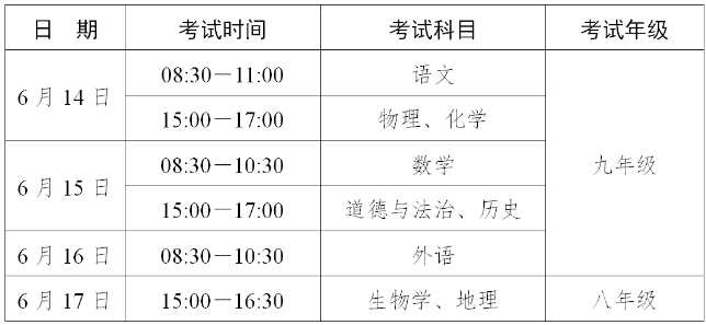 安徽合肥中考時(shí)間2022年具體時(shí)間安排為6月14日-6月16日舉行,具體時(shí)間及科目表安排如下: