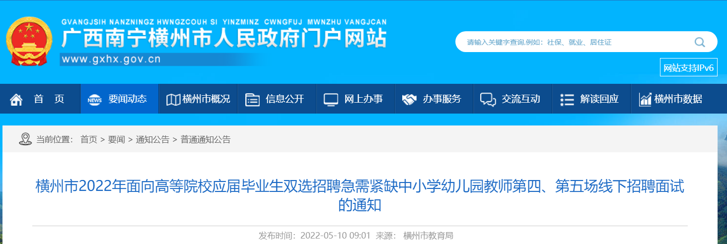 2022廣西南寧橫州市面向高校應(yīng)屆生雙選招聘教師第四、第五場(chǎng)線下招聘面試通知已發(fā)布,面試時(shí)間:2022年5月12日、13日,現(xiàn)將原文發(fā)布如下: