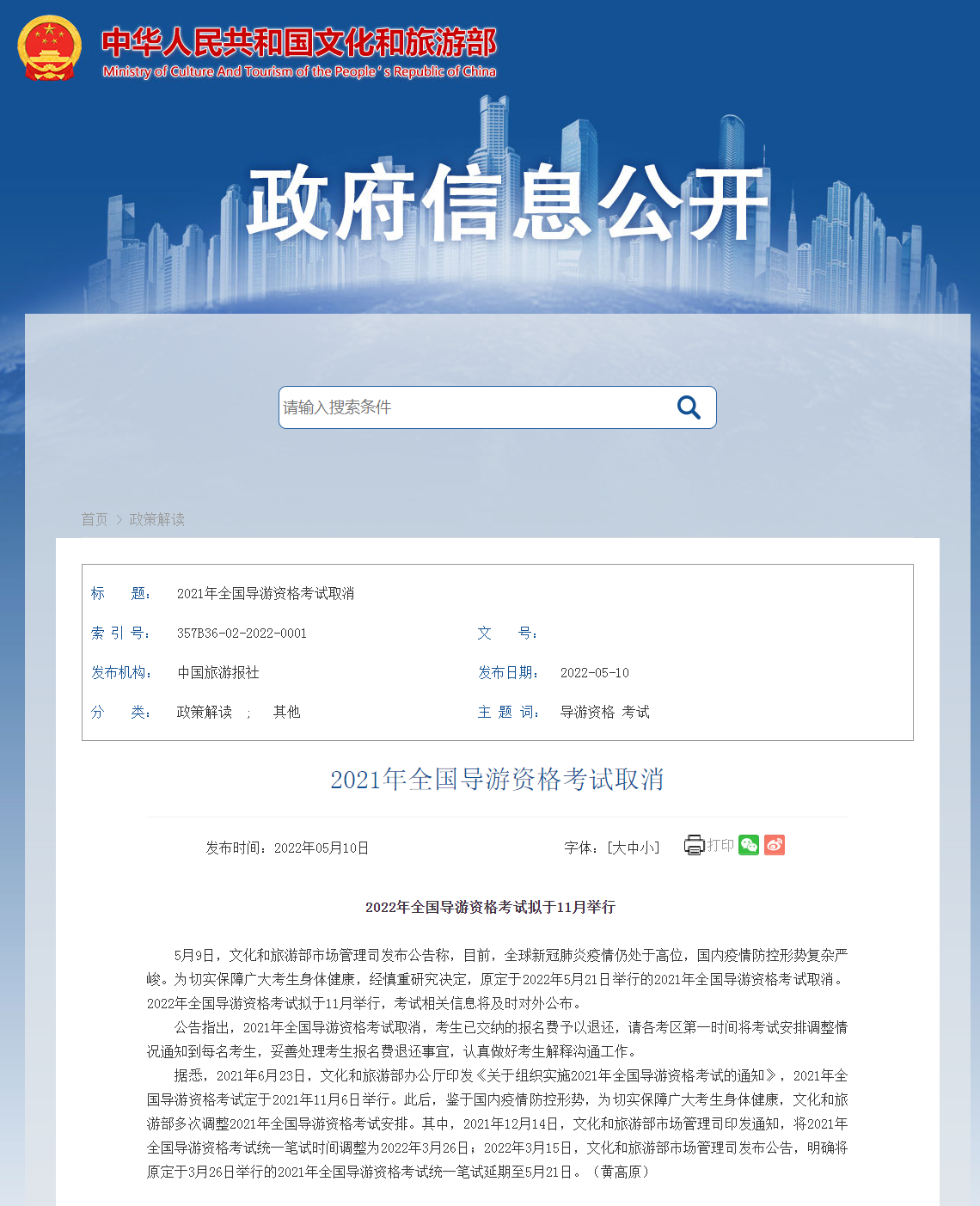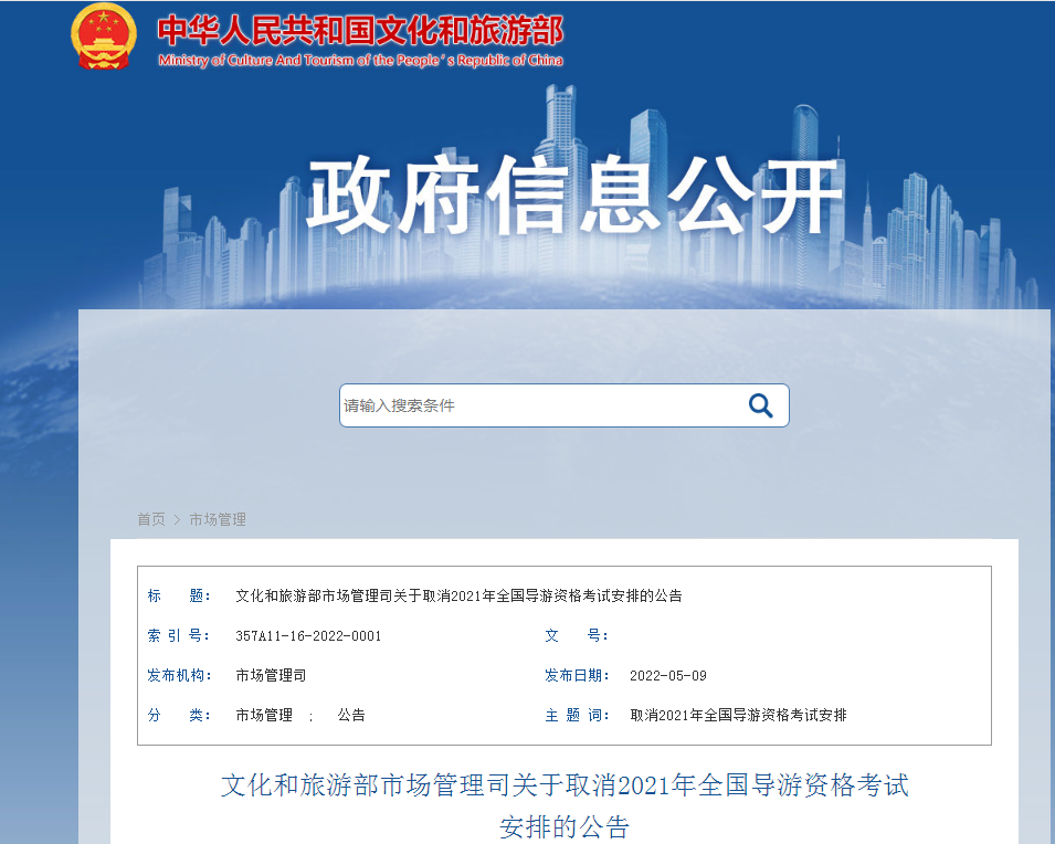 從中華人民共和國(guó)文化和旅游部發(fā)布的《文化和旅游部市場(chǎng)管理司關(guān)于取消2021年全國(guó)導(dǎo)游資格考試安排的公告》一文得知,原定于2022年5月21日舉行的2021年廣西導(dǎo)游資格考試取消,詳情如下: