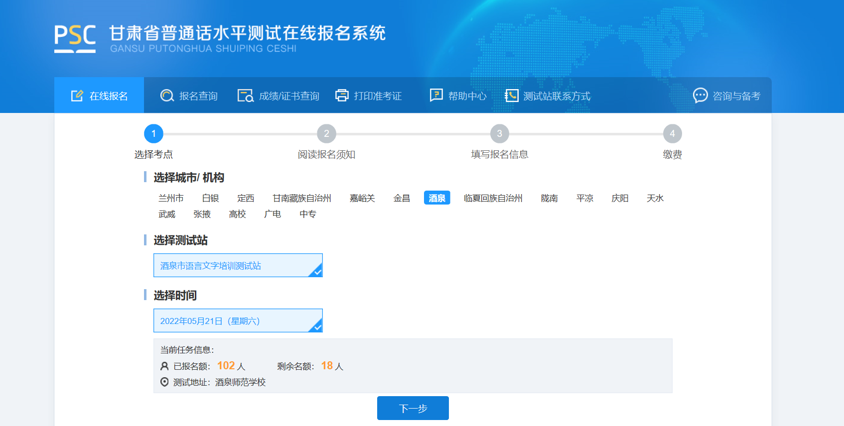 1.2022年5月12日至5月13日,考生登錄網(wǎng)址http://gsbm.cltt.org/pscweb/index.html(建議使用谷歌瀏覽器打開(kāi)),依據(jù)提示進(jìn)行操作,選擇“酒泉市語(yǔ)言文字培訓(xùn)測(cè)試站”,在右側(cè)選擇測(cè)試時(shí)間(5月21日、22日),進(jìn)行在線預(yù)報(bào)名。