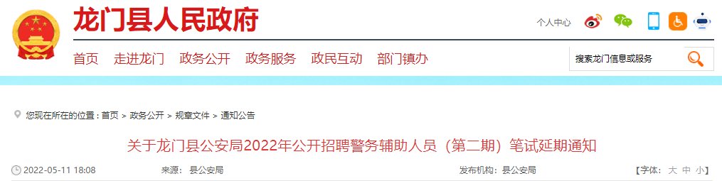 關(guān)于龍門縣公安局2022年公開招聘警務(wù)輔助人員(第二期)筆試延期通知