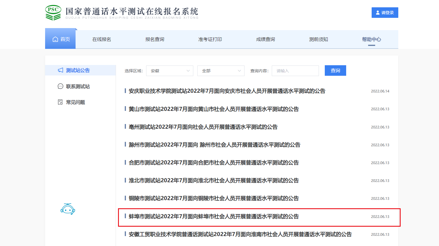 從國(guó)家普通話水平測(cè)試在線報(bào)名系統(tǒng)獲悉,2022年7月安徽蚌埠面向會(huì)人員開展普通話水平測(cè)試的公告已公布,報(bào)名時(shí)間為6月20日-6月26日,準(zhǔn)考證打印時(shí)間為考前三天,考試時(shí)間為7月5日-7月15日,成績(jī)查詢時(shí)間為考后1個(gè)月左右,具體詳情如下: