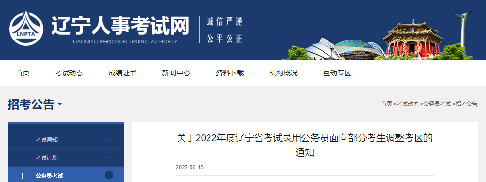 2022年遼寧省考試錄用公務(wù)員面向部分考生調(diào)整考區(qū)通知已公布,為了方便廣大考生的查閱,下面為您詳細(xì)介紹一下本次公務(wù)員考試調(diào)整考區(qū)的具體事宜,希望廣大考生及時(shí)關(guān)注,如有相關(guān)疑問(wèn),請(qǐng)關(guān)注公務(wù)員頻道為您實(shí)時(shí)做出的更新。