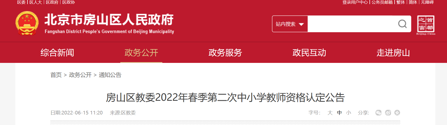 從北京房山區(qū)人民政府獲悉,2022年春季北京房山區(qū)第二次中小學教師資格認定公告 已公布,請相關人員仔細閱讀,具體詳情如下: