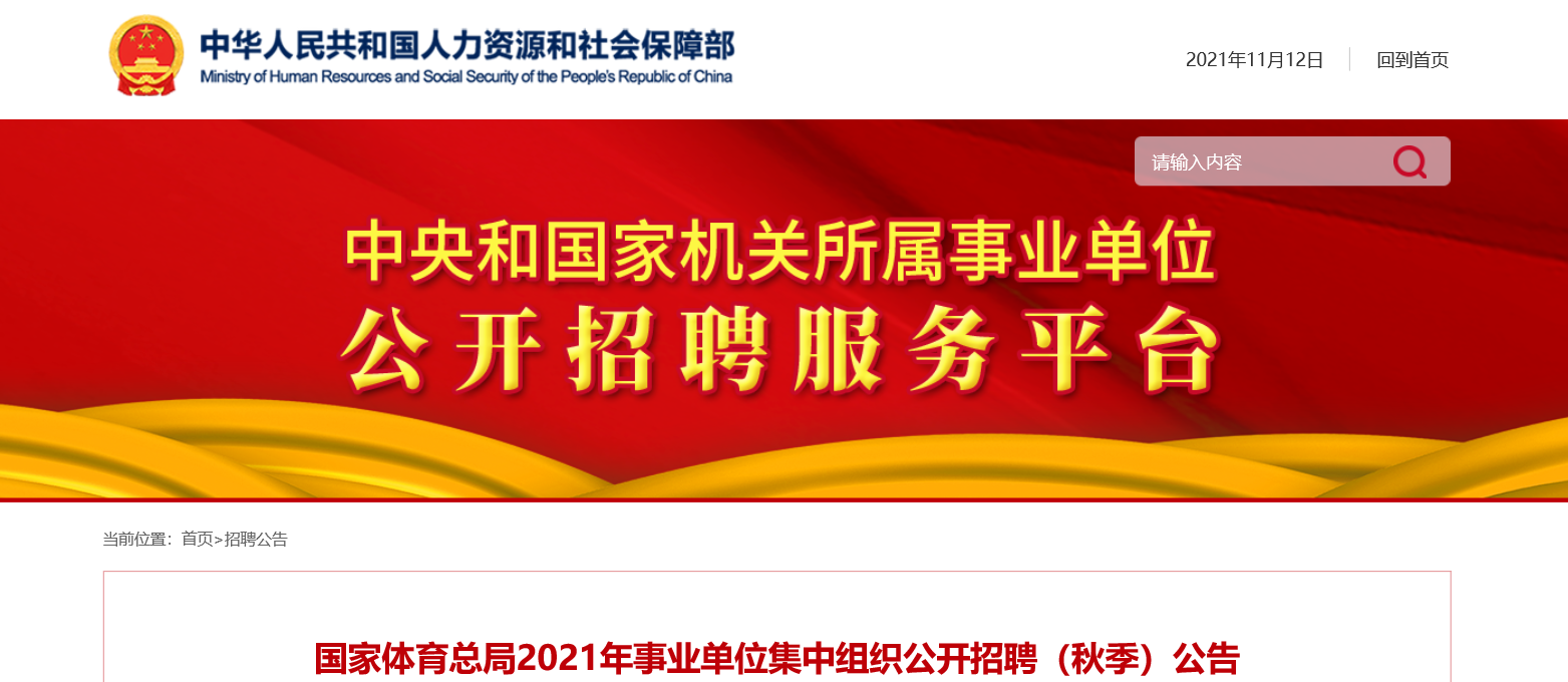 招聘的單位、崗位、條件等可查詢招聘專欄中的《國(guó)家體育總局2021年事業(yè)單位集中組織公開招聘(秋季)崗位情況一覽表》,亦可登陸進(jìn)入招聘系統(tǒng)進(jìn)行查詢。