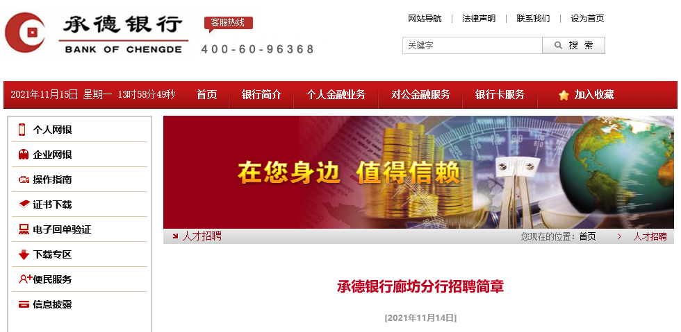 2021承德銀行河北廊坊分行招聘40人,報名時間:2021年11月14日0:00至2021年11月30日24:00,現(xiàn)將招聘公告原文發(fā)布如下: