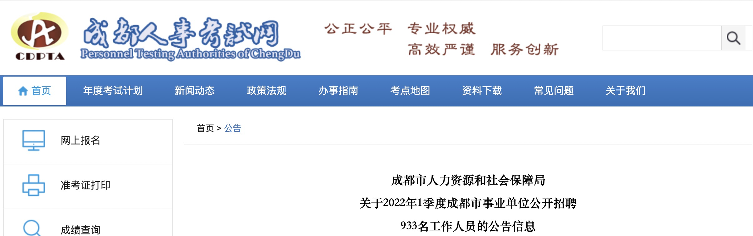 (一)應(yīng)聘考生可登陸成都市人力資源和社會保障局http://cdhrss.chengdu.gov.cn,點擊右側(cè)“人事考試中心”登陸成都人事考試網(wǎng)http://cdpta.cdhrss.chengdu.gov.cn/netpage/index.do,查看市屬事業(yè)單位和區(qū)(市)縣屬事業(yè)單位的考試招聘公告并進行網(wǎng)上報名。市屬事業(yè)單位和區(qū)(市)縣屬事業(yè)單位的考核招聘公告請在《2022年1季度成都市事業(yè)單位公開招聘單位》(附件1)中通過招聘單位公開網(wǎng)站查看。