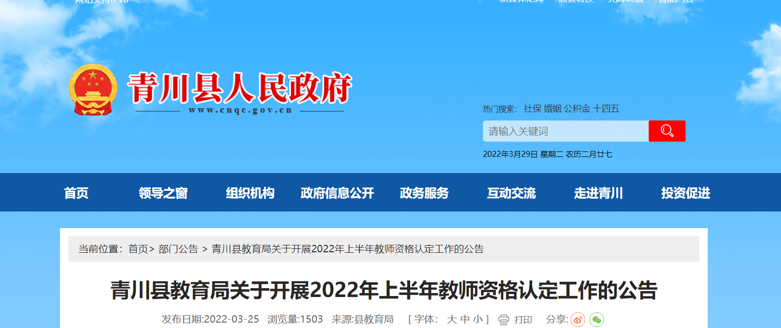 從青川縣人民政府獲悉,2022年上半年四川廣元青川縣教師資格認(rèn)定工作的公告已公布,請相關(guān)人員仔細(xì)閱讀,具體詳情如下: