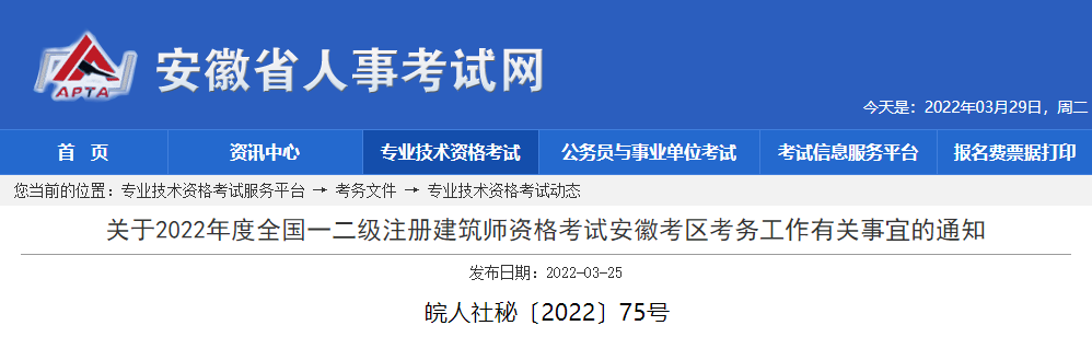 根據(jù)人力資源和社會(huì)保障部人事考試中心《關(guān)于2022年度全國(guó)一、二級(jí)注冊(cè)建筑師資格考試考務(wù)工作的通知》(人考中心函〔2022〕14號(hào))精神,結(jié)合我省實(shí)際,現(xiàn)就2022年度全國(guó)一、二級(jí)注冊(cè)建筑師資格考試安徽考區(qū)考務(wù)工作有關(guān)事宜通知如下。