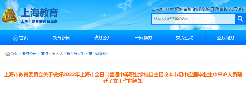 從上海教育了解到,關(guān)于做好2022年上海市全日制普通中等職業(yè)學(xué)校自主招收本市初中應(yīng)屆畢業(yè)生中來滬人員隨遷子女工作的通知已發(fā)布,詳細內(nèi)容如下: