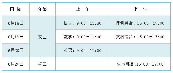 普通初中學(xué)業(yè)水平考試時(shí)間和科目安排: