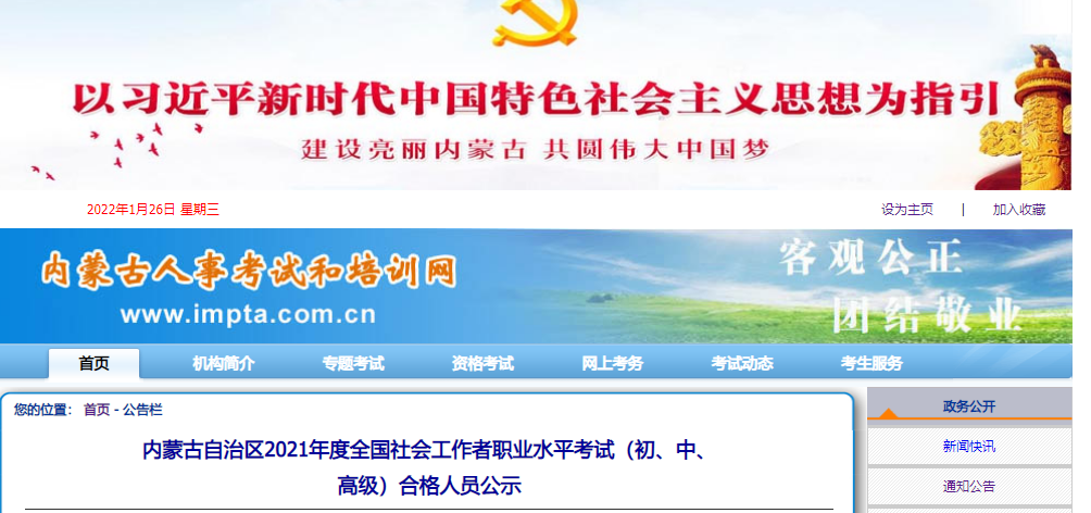 從內(nèi)蒙古人事考試和培訓(xùn)網(wǎng)獲悉,2021年內(nèi)蒙古全國社會工作者職業(yè)水平考試(初、中、高級)合格人員公示已公布,請相關(guān)人員仔細閱讀,具體詳情如下: