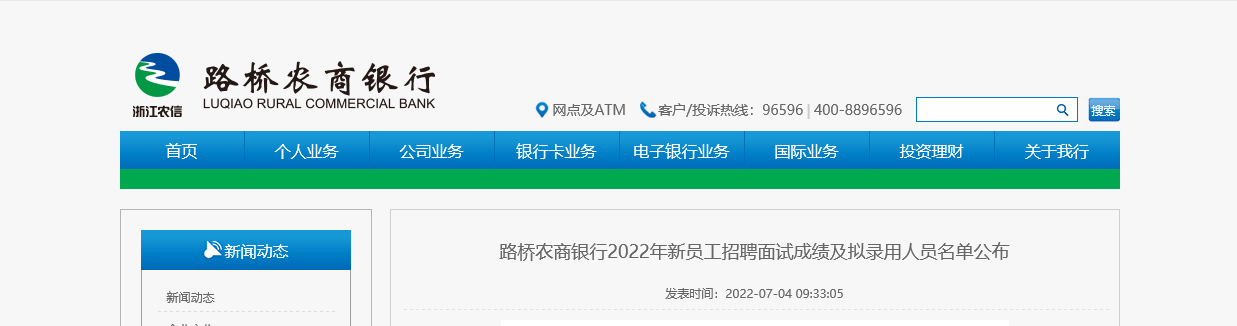 2022年浙江路橋農(nóng)商銀行新員工招聘面試成績(jī)及擬錄用人員名單公布已發(fā)布,現(xiàn)將公告發(fā)布如下: