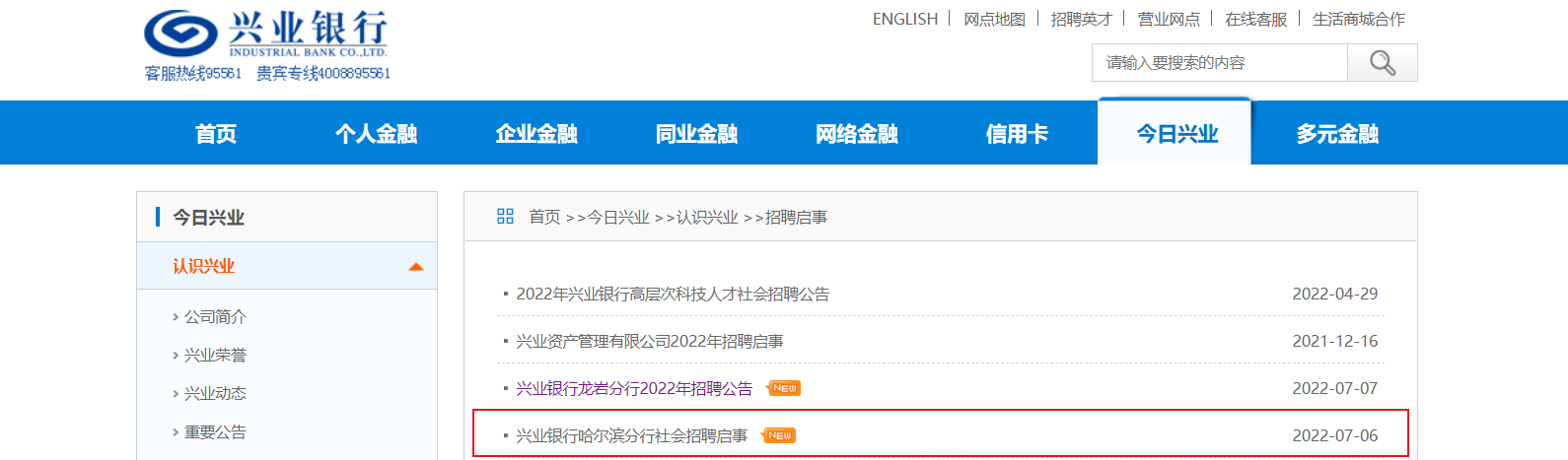 2022興業(yè)銀行黑龍江哈爾濱分行社會(huì)招聘若干人,簡(jiǎn)歷投遞截止時(shí)間:2022年7月31日,現(xiàn)將招聘公告發(fā)布如下: