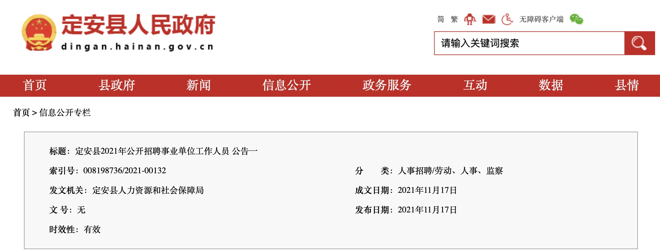 2021年海南定安縣事業(yè)單位工作人員招聘公告【42人】已發(fā)布,網(wǎng)絡(luò)報(bào)名時(shí)間為:2021年11月24日8:00至11月30日16:00,現(xiàn)將招聘公告原文發(fā)布如下: