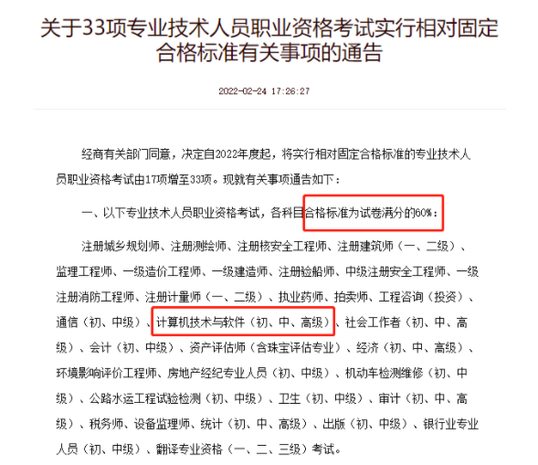 自2022年度起,計算機技術(shù)與軟件(初、中、高級)考試合格標準各科目合格標準為試卷滿分的60%,即:2022上半年山東計算機技術(shù)與軟件專業(yè)技術(shù)資格考試初級、中級、高級各科目合格標準均為45分(各科目試卷滿分均為75分)。