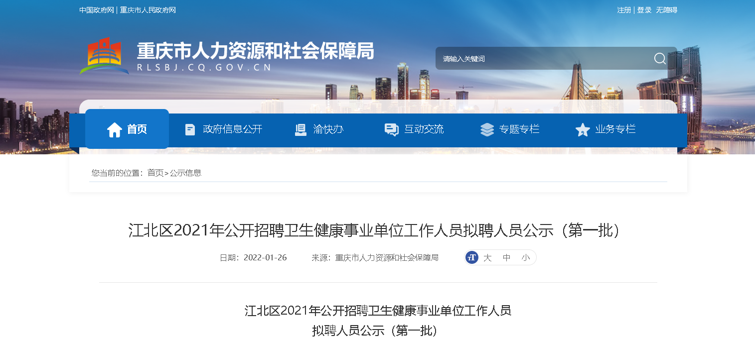 2021重慶江北區(qū)招聘衛(wèi)生健康事業(yè)單位人員擬聘人員公示(第一批)已出,公示時間:2022年1月27日—2月9日(7個工作日),現(xiàn)將招聘公告原文發(fā)布如下: