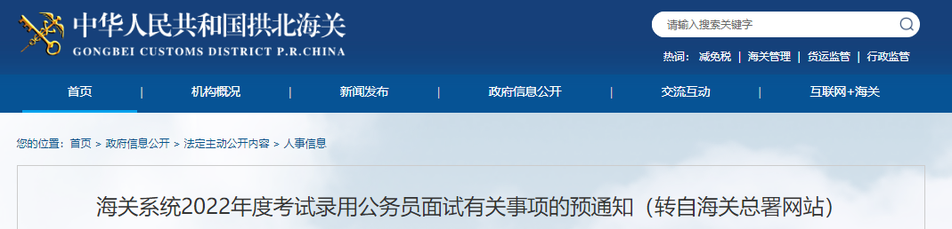 海關(guān)系統(tǒng)2022年度考試錄用公務(wù)員面試工作擬于2022年3月中下旬舉行,具體時(shí)間詳見(jiàn)各招錄海關(guān)面試公告。