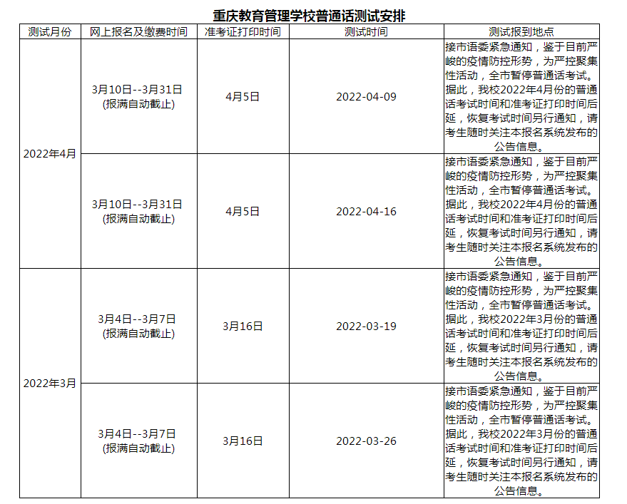 從重慶各普通話測試站獲悉,2022年重慶普通話考試時間安排已陸續(xù)公布,具體詳情如下: