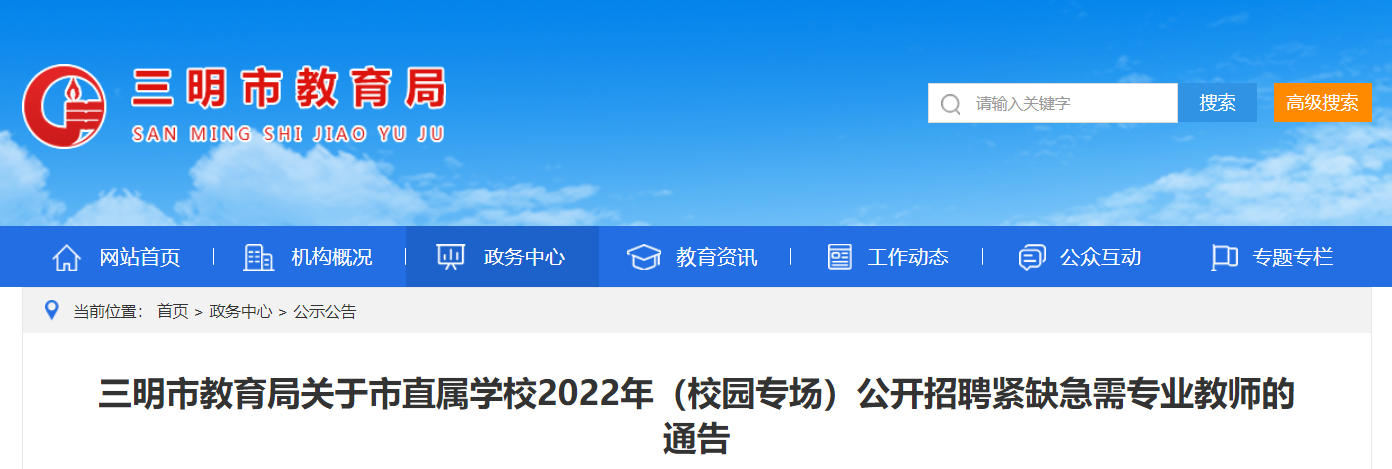 本次公開(kāi)招聘通告、變更公告、擬聘用人員公示等具體事宜在三明市教育局網(wǎng)站(https://www.smjy.com.cn/)、各招聘單位校園網(wǎng)等發(fā)布。