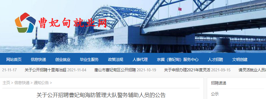 2021年河北唐山市曹妃甸區(qū)公開(kāi)招聘曹妃甸海防管理大隊(duì)警務(wù)輔助人員公告已公布,為了方便廣大考生的查閱,下面為您詳細(xì)介紹一下本次招聘警務(wù)輔助人員的具體事宜,希望廣大考生及時(shí)關(guān)注,如有相關(guān)疑問(wèn),請(qǐng)關(guān)注為您實(shí)時(shí)做出的更新。