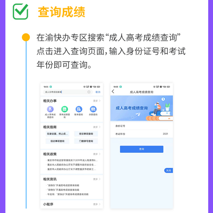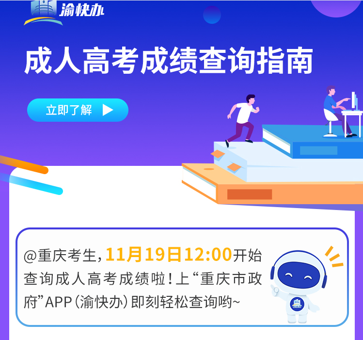 重慶市2021年成人高考成績查詢通道將于11月19日12點(diǎn)開啟,為方便廣大考生及時(shí)快捷地查詢成績,“渝快辦”聯(lián)手市教育考試院同時(shí)上線成人高考成績查詢功能,考生登錄“重慶市政府”APP(渝快辦)即可快速查詢成績。成績查詢通道開放初期,考生查詢較為集中,可能會出現(xiàn)短暫性的網(wǎng)絡(luò)擁堵現(xiàn)象,如遇此類情況,考生可錯(cuò)開高峰時(shí)間查詢。