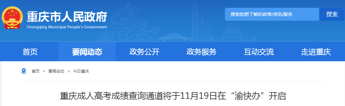 從重慶市人民政府網(wǎng)了解到,2021年重慶成人高考成績查詢通道將于11月19日開啟,考生可登錄“重慶市政府”APP(渝快辦)即可快速查詢成績。詳細(xì)內(nèi)容如下: