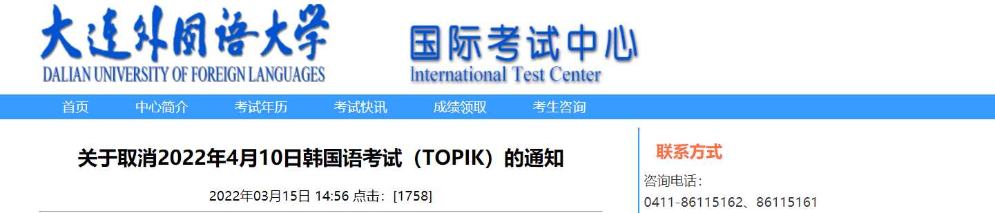 從大連外國語大學考試中心獲悉,遼寧大連外國語大學取消2022年4月10日韓國語考試(IK)的通知已公布,請相關人員仔細閱讀,具體詳情如下:
