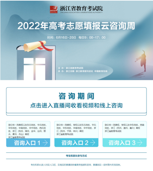 從浙江省教育考試院了解到,浙江省2022年高考志愿填報(bào)云咨詢周活動(dòng)啟幕!詳細(xì)內(nèi)容如下: