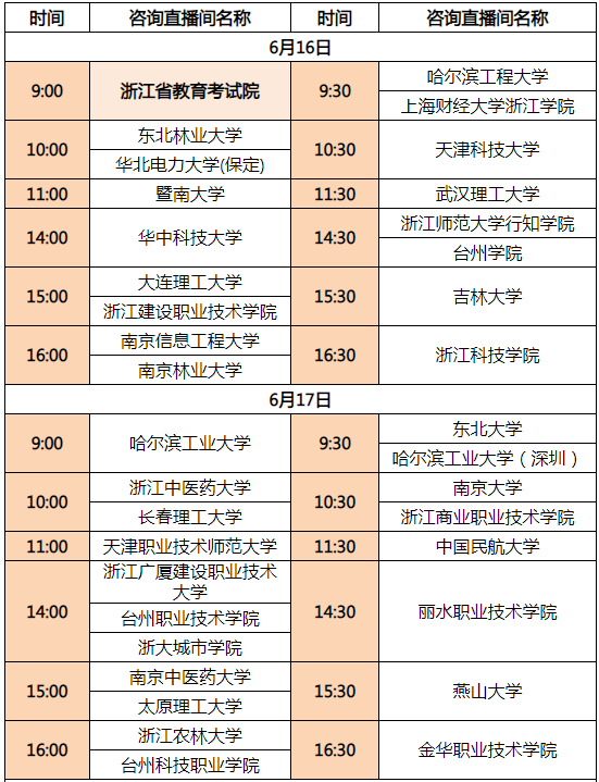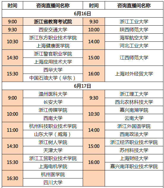 溫馨提示:本次浙江省教育考試院主辦,浙江日?qǐng)?bào)、浙江教育報(bào)刊總社、中國教育在線協(xié)同承辦的公益活動(dòng),由千聊學(xué)習(xí)平臺(tái)提供技術(shù)支持。上述單位及各高校均不會(huì)收取任何費(fèi)用,請(qǐng)考生和家長根據(jù)自己需要和高校排期選擇直播間參與互動(dòng)咨詢。