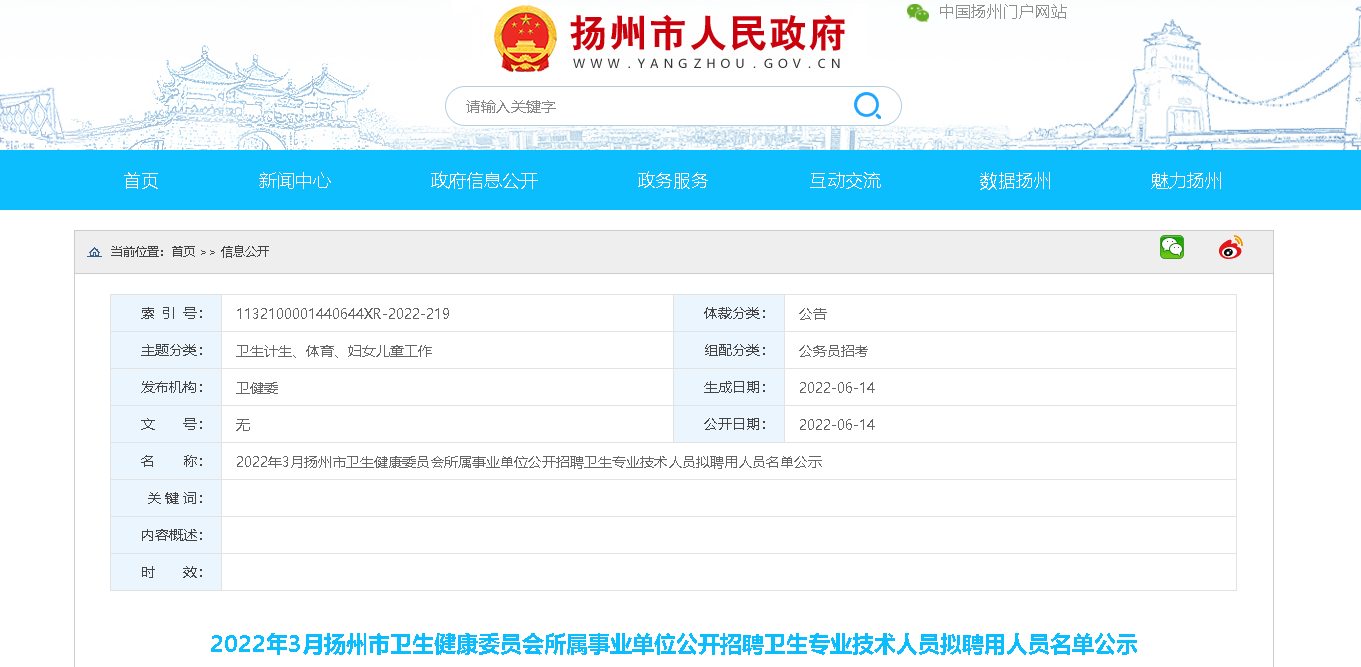 2022年3月江蘇揚州市衛(wèi)生健康委員會所屬單位招聘衛(wèi)生專技人員擬聘公示(一)已出,公示時間2022年6月14日至6月22日,現(xiàn)將招聘公告原文發(fā)布如下: