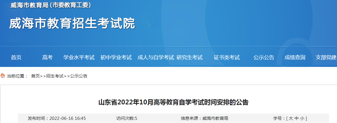 自考頻道從威海市教育局了解到,山東威海2022年10月高等教育自學(xué)考試時(shí)間安排的公告已發(fā)布,詳情如下:
