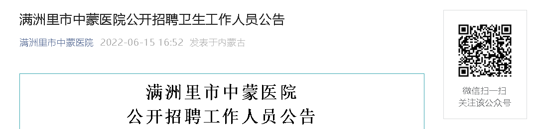 2022內(nèi)蒙古呼倫貝爾滿洲里市中蒙醫(yī)院招聘衛(wèi)生工作人員6人,報名時間:2022年6月16日—2022年6月26日,現(xiàn)將招聘公告原文發(fā)布如下: