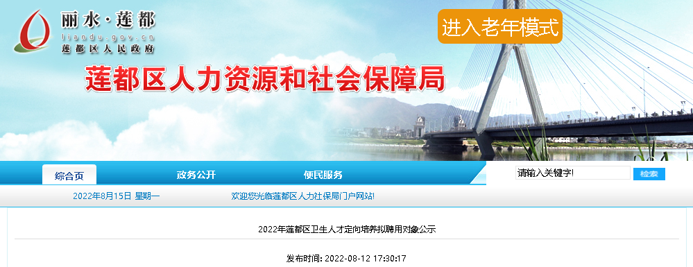 2022浙江麗水蓮都區(qū)衛(wèi)生人才定向培養(yǎng)擬聘用對(duì)象公示已出,公示時(shí)間:2022年8月12日起到8月19日,現(xiàn)將招聘公示原文發(fā)布如下: