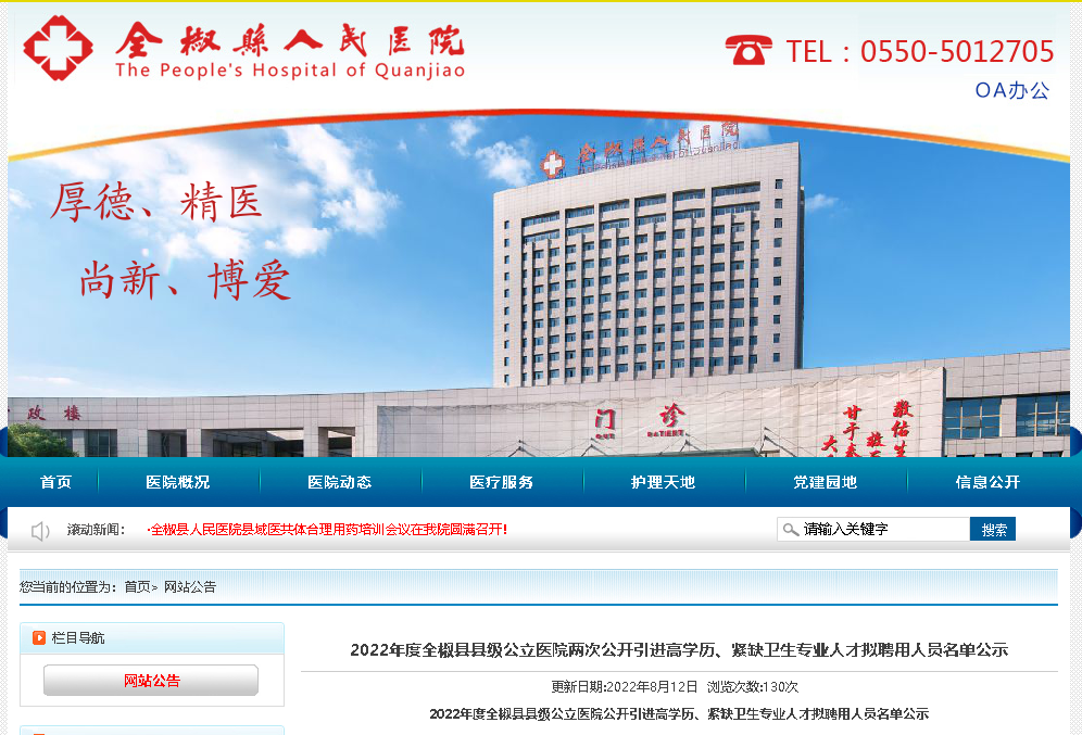 2022安徽滁州市全椒縣縣級(jí)公立醫(yī)院兩次引進(jìn)高學(xué)歷、緊缺衛(wèi)生專業(yè)人才擬聘用名單公示已出,公示時(shí)間:2022年8月12日至8月18日,現(xiàn)將招聘公示原文發(fā)布如下:
