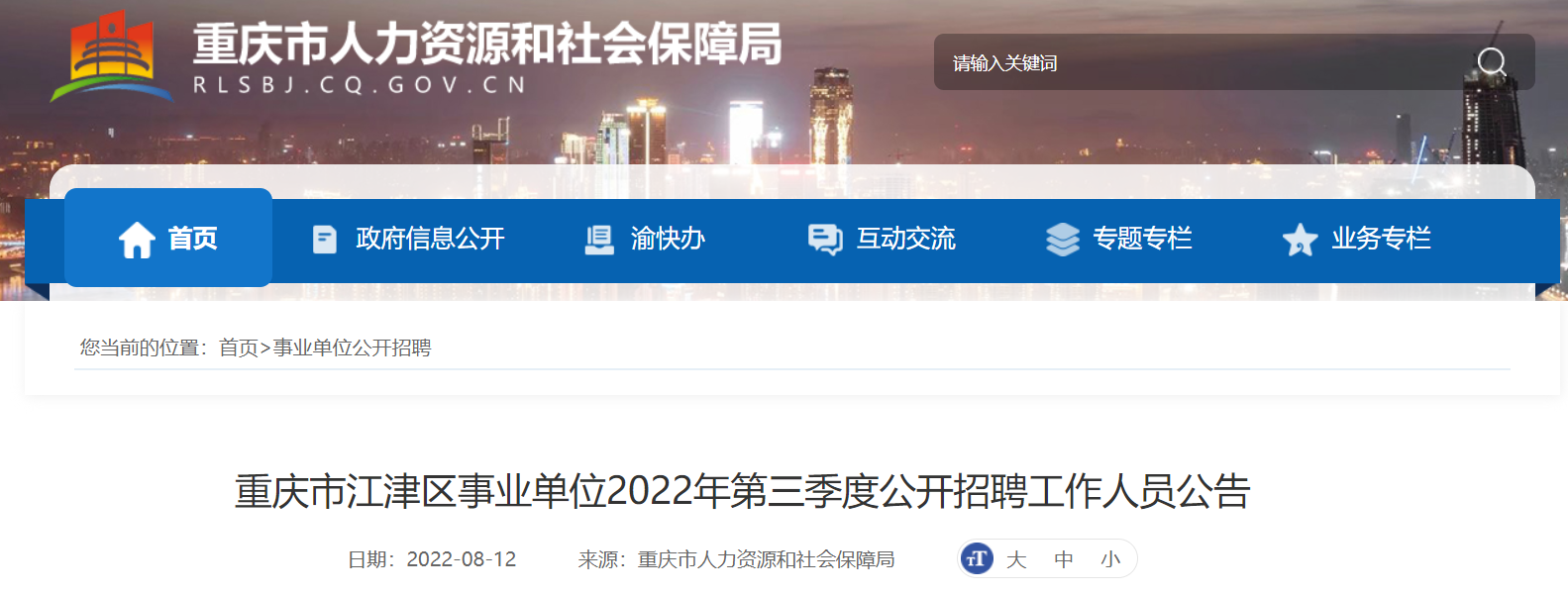 2022第三季度重慶市江津區(qū)事業(yè)單位招聘公告【47人】已發(fā)布。網(wǎng)上報(bào)名時(shí)間為2022年8月18日9:00至8月23日9:00。現(xiàn)將招聘公告原文發(fā)布如下:
