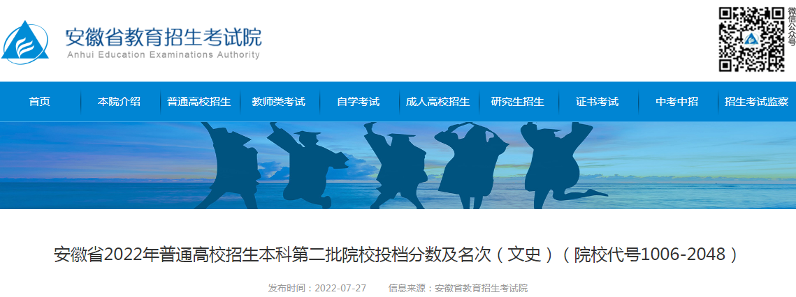 從安徽省教育招生考試院了解到,安徽2022年普通高校招生本科第二批院校投檔分數及名次(文史)(院校代號1006-2048)已發(fā)布,詳細內容如下: