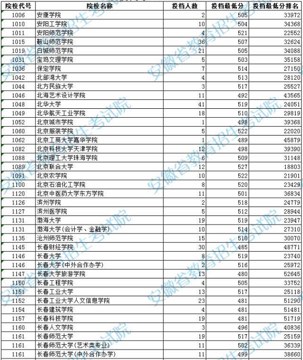 點擊查看完整版:安徽省2022年普通高校招生本科第二批院校投檔分數及名次(文史)(院校代號1006-2048)
