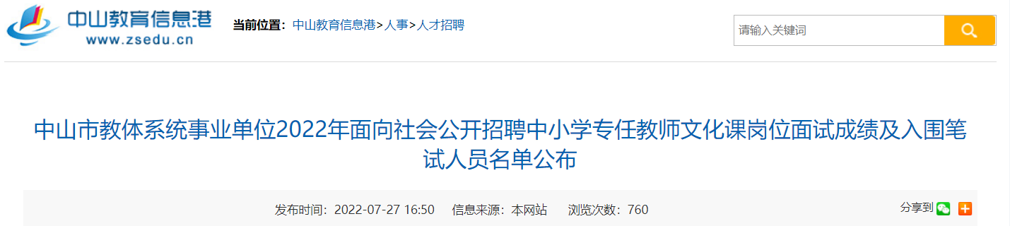 2022廣東中山市教體系統(tǒng)招聘中小學(xué)專任教師文化課崗位面試成績及入圍筆試人員名單已公布,現(xiàn)將原文發(fā)布如下: