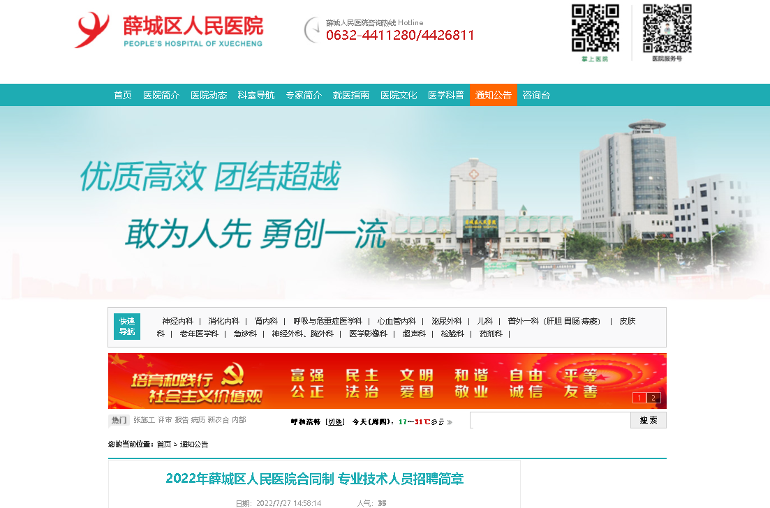根據(jù)薛城區(qū)人民醫(yī)院事業(yè)發(fā)展需要,經(jīng)研究并報(bào)薛城區(qū)衛(wèi)生健康局批準(zhǔn),面向社會(huì)公開招聘合同制專業(yè)技術(shù)人員,現(xiàn)將招聘的有關(guān)事項(xiàng)公告如下:
