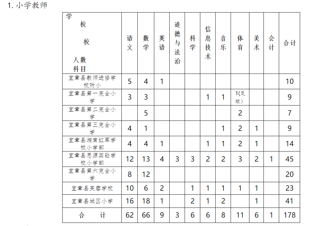 根據(jù)我縣城區(qū)學(xué)校教育教學(xué)工作需要,經(jīng)縣城區(qū)學(xué)校教師選聘工作領(lǐng)導(dǎo)小組同意,2022年城區(qū)學(xué)校公開(kāi)選聘小學(xué)教師178名、初中教師86名?,F(xiàn)公告如下:一、選聘崗位及人數(shù)