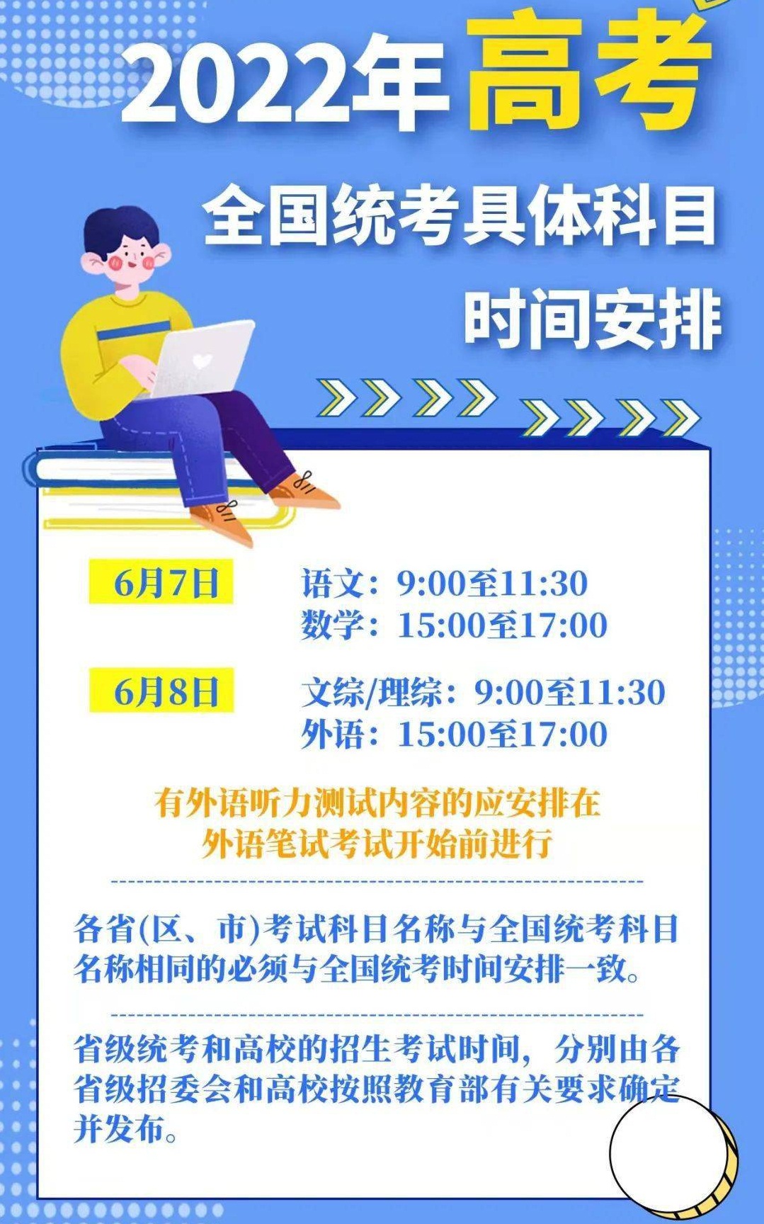 高考頻道根據(jù)教育部公布的《關(guān)于做好2022年普通高校招生工作的通知》了解到,新疆高考時間2022年具體時間及科目安排公布,具體時間安排在2022年6月7日至6月8日期間舉行。具體如下: