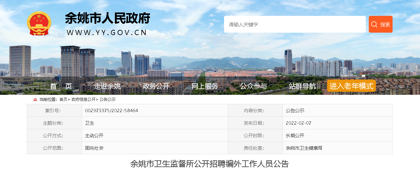 2022浙江寧波余姚市衛(wèi)生監(jiān)督所招聘編外人員1人,報名時間:2022年2月16日(上午9:00—11:30,下午1:30—4:30)截止,現(xiàn)將招聘公告原文發(fā)布如下: