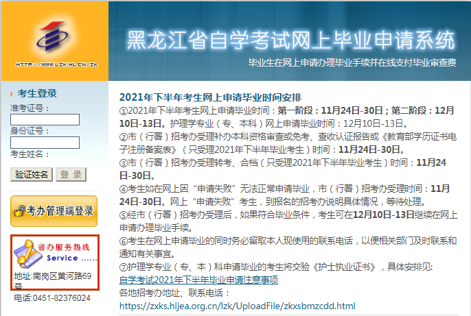 3.考生登陸“自學(xué)考試網(wǎng)上畢業(yè)申請系統(tǒng)”,如果提示“申請失敗”可與報(bào)名招考院聯(lián)系咨詢(聯(lián)系電話:https://zxks.hljea.org.cn/lzk/UploadFile/zkxsbmzcdd.html),市(地)招考院受理時(shí)間:11月24日-30日。經(jīng)市(地)招考院受理后符合畢業(yè)條件的考生,可于12月10日-13日繼續(xù)在網(wǎng)上申請辦理畢業(yè)。