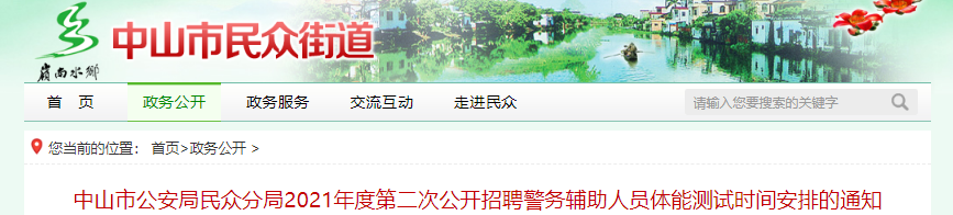 根據(jù)《中山市公安局民眾分局2021年度第二次公開(kāi)招聘警務(wù)輔助人員公告》,現(xiàn)將體能測(cè)試時(shí)間予以通知,具體安排如下: