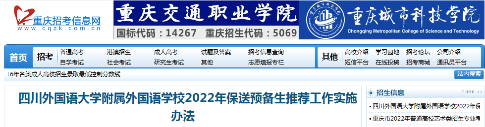 從重慶招考信息網(wǎng)了解到,四川外國語大學附屬外國語學校2022年保送預(yù)備生推薦工作實施辦法已發(fā)布,詳細內(nèi)容如下: