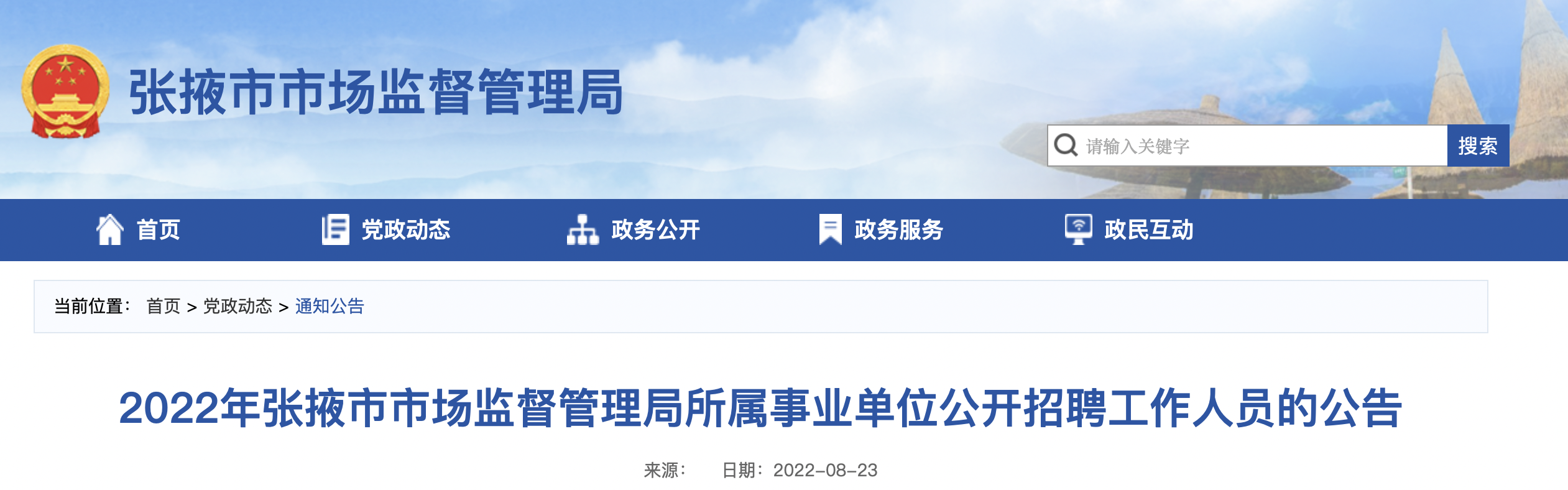 2022年甘肅張掖市市場(chǎng)監(jiān)督管理局所屬事業(yè)單位工作人員招聘公告【2人】已發(fā)布,報(bào)名時(shí)間為:2022年8月29日至9月1日,現(xiàn)將招聘公告原文發(fā)布如下: