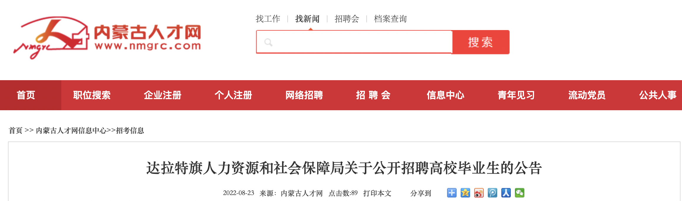 2022年內(nèi)蒙古鄂爾多斯達(dá)拉特旗高校畢業(yè)生招聘公告【50人】已發(fā)布,報(bào)名時(shí)間為:2022年8月29日—2022年9月2日,現(xiàn)將招聘公告原文發(fā)布如下: